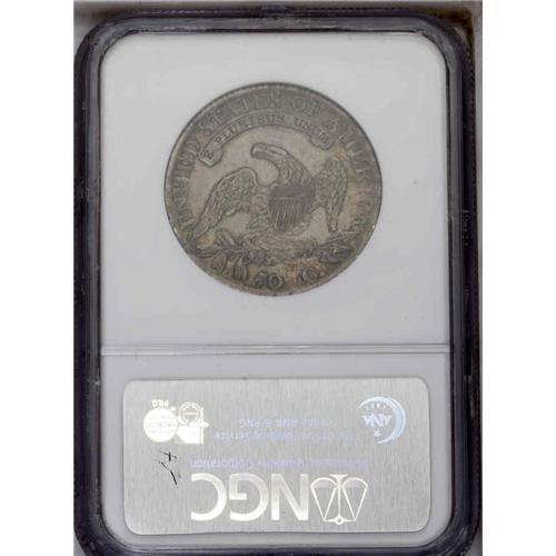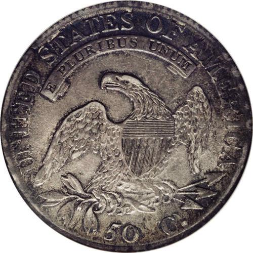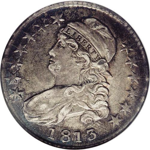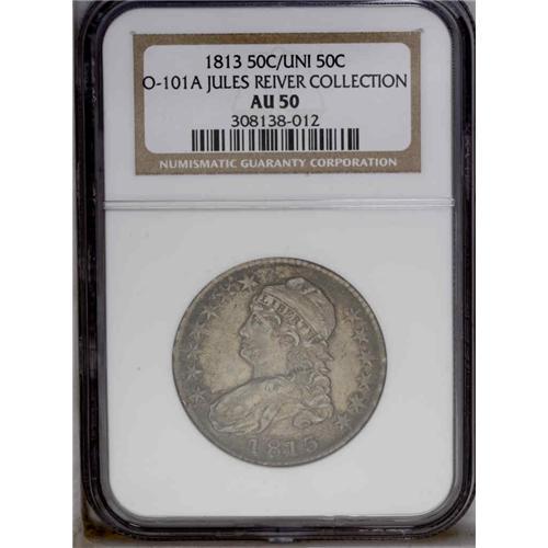<B>1813<50C> 50C Over UNI AU50 NGC.</B></I> O-101a, High R.3. This lovely and collectible coin mixes greenish-brown toning with hints of bronze in protected areas. Numerous die clash marks are evident on both sides. The strike is bold and centered, although advanced die erosion on both sides merges the peripheral details with the dentilation.<BR><I>Ex: Fidelity (5/5/1989).</B></I> Envelope Included.