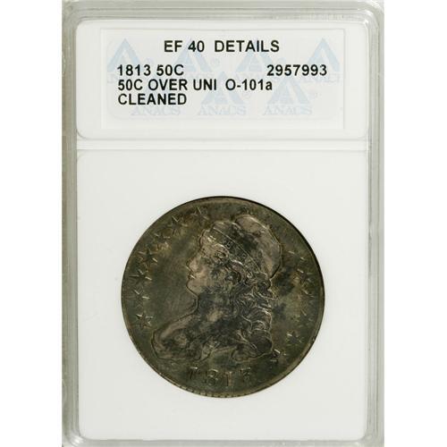 <B>1813 50C 50C Over UNI--Cleaned--ANACS. XF40 Details.</B></I> O-101a. NGC Census: (4/42). PCGS Population (7/47). Numismedia Wsl. Price for NGC/PCGS coin in XF40: $246. (#6104)<BR><BR><b>Shipping:</b> Coins & Currency (<a target="_blank" href="http://www.heritageauctions.com/common/shipping.php">view shipping information</a>)
