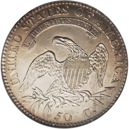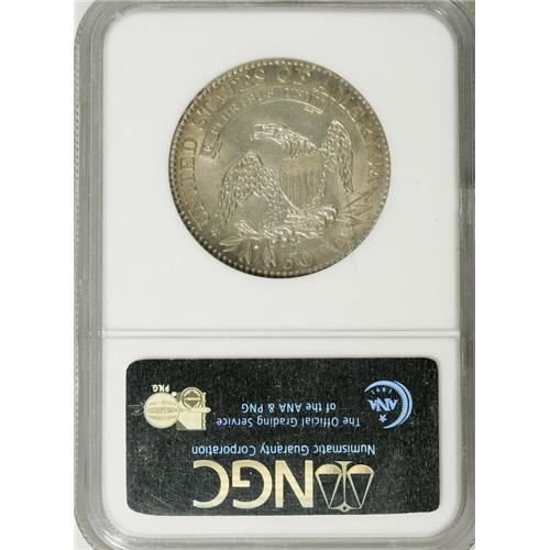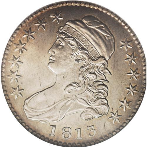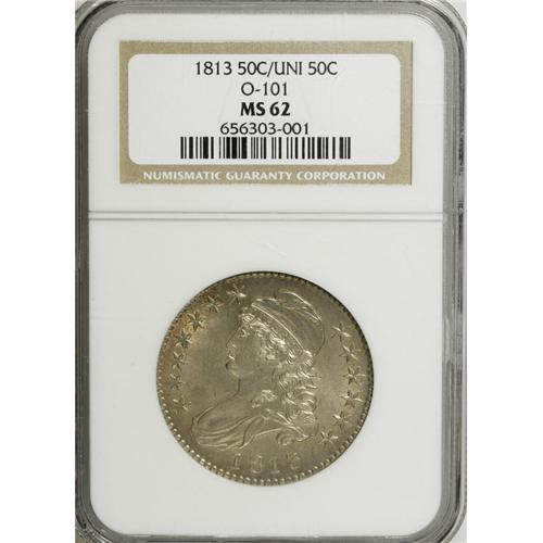 <B>1813 50C 50C Over UNI MS62 NGC.</B></I> O-101, R.2. A popular <I>Guide Book</B></I> variety with a blundered reverse. The UNI in UNITED was engraved in place of the denomination, before the error was discovered and partially effaced. Light golden-brown color graces the peripheries, while the fields and devices are bathed in pearl-gray hues. This satiny Half Dollar has no abrasions of consequence. Well struck except for minor flatness on the nostril, chin, eyebrow, and top fold of the cap.<BR><BR><b>Shipping:</b> Coins & Currency (<a target="_blank" href="http://www.heritageauctions.com/common/shipping.php">view shipping information</a>)