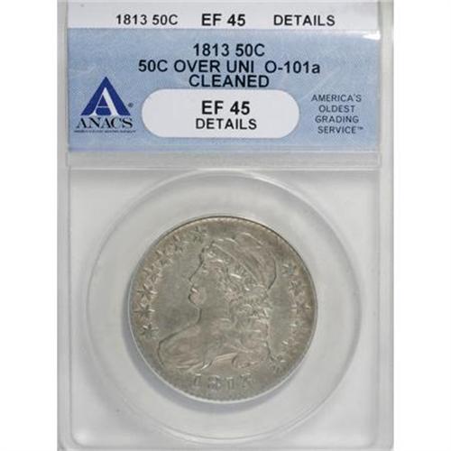<B>1813 50C 50C Over UNI--Cleaned--ANACS. XF45 Details.</B></I> O-101a. NGC Census: (10/36). PCGS Population (14/37). Numismedia Wsl. Price for NGC/PCGS coin in XF45: $464. (#6104)<BR><BR><B>Coin Engraver:</B> John Reich<BR><BR><b>Shipping:</b> Coins & Currency (<a target="_blank" href="http://www.heritageauctions.com/common/shipping.php">view shipping information</a>)