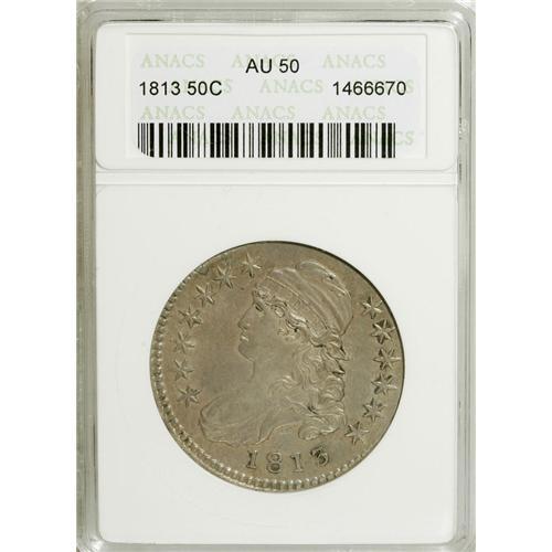 <B>1813 50C AU50 ANACS.</B></I> O-107a, R-1. NGC Census: (21/249). PCGS Population (43/169). Mintage: 1,241,903. Numismedia Wsl. Price for NGC/PCGS coin in AU50: $300. (#6103)<BR><BR><b>Shipping:</b> Coins & Currency (<a target="_blank" href="http://www.heritageauctions.com/common/shipping.php">view shipping information</a>)