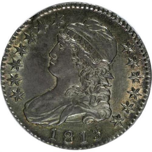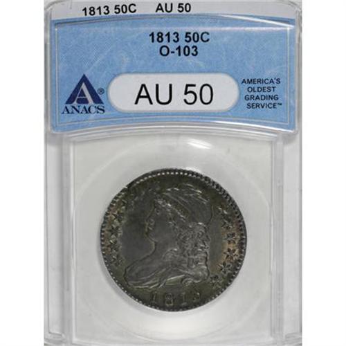 <B>1813 50C AU50 ANACS.</B></I> O-103. NGC Census: (23/255). PCGS Population (44/186). Mintage: 1,241,903. Numismedia Wsl. Price for NGC/PCGS coin in AU50: $300. (#6103)<BR><BR><B>Coin Engraver:</B> John Reich<BR><BR><b>Shipping:</b> Coins & Currency (<a target="_blank" href="http://www.heritageauctions.com/common/shipping.php">view shipping information</a>)