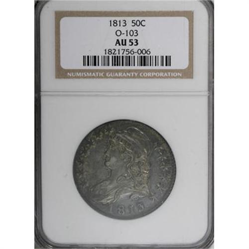 <B>1813 50C AU53 NGC.</B></I> O-103, R.2. Late dies with peripheral design spreading and prominent clash marks. Deep olive and ocean-blue toning consumes this lightly circulated early silver type coin.<BR><BR><B>Coin Engraver:</B> John Reich<BR><BR><b>Shipping:</b> Coins & Currency (<a target="_blank" href="http://www.heritageauctions.com/common/shipping.php">view shipping information</a>)