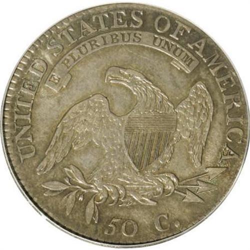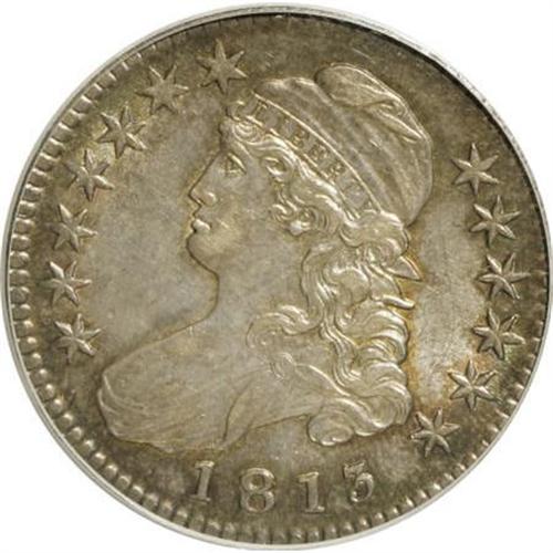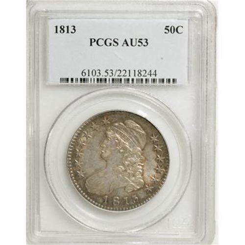<B>1813 50C AU53 PCGS.</B></I> O-103. PCGS Population (26/157). NGC Census: (32/219). Mintage: 1,241,903. Numismedia Wsl. Price for NGC/PCGS coin in AU53: $367. (#6103)<BR><BR><B>Coin Engraver:</B> John Reich<BR><BR><b>Shipping:</b> Coins & Currency (<a target="_blank" href="http://www.heritageauctions.com/common/shipping.php">view shipping information</a>)