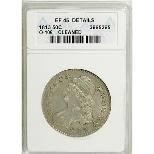 <B>1813 50C --Cleaned--ANACS. XF45 Details.</B></I> O-106. NGC Census: (49/270). PCGS Population (37/212). Mintage: 1,241,903. Numismedia Wsl. Price for NGC/PCGS coin in XF45: $216. (#6103)<BR><BR><b>Shipping:</b> Coins & Currency (<a target="_blank" href="http://www.heritageauctions.com/common/shipping.php">view shipping information</a>)