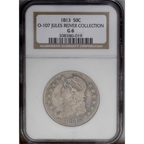 <B>1813<50C> Good 6 NGC.</B></I> Ex: Jules Reiver Collection. O-107a, R.1. A light pink-gray piece with occasional freckles of charcoal debris. Both sides are well worn from circulation, but noticeable marks are absent. The margins have prominent die cracks, as produced. Envelope Included. <BR><BR><B>Important notice:</B> Heritage usually auctions material at the rate of 200-250 lots per hour. On some occasions eBay Live bid software or the Internet may not be able to keep up with the pace of the auction. We recommend placing a realistic absentee bid now as insurance to avoid disappointment. Occasionally the auctioneer may eliminate or reject an eBay Live bid, and the auctioneer may also reopen a lot after the close of the eBay live bidding (usually because we missed an audience bid), and may reject your bid even if it shows you as the winning bidder. By bidding via eBay Live, you agree that Heritage may award the lot to another bidder at its sole discretion under the circumstances described above or any other reasonable circumstances. Since eBay bids are not shown to us until we open the lot on the floor, we treat those bids just like floor bids. In most cases the floor responds before the eBay bid is presented to us, due to Internet lag time, so for consistency we have made it a policy that floor bids are always considered first over tie eBay live bids. Also please note that all Heritage lots purchased through eBay Live carry a 20% Buyer's Premium. Please make sure you read the Terms and Conditions before you bid. This lot is being auctioned in conjunction with a live floor auction by Heritage Galleries & Auctioneers. All final auction and invoice information will be supplied by Heritage Galleries & Auctioneers, and all other information should be considered preliminary. Lot:1936 <BR><BR><B>Winning Notification and Billing:</B> After the FINAL session in this auction is complete, Heritage will send e-mail and snail mail invoices. This process normally takes several days. All final auction and invoice information will be supplied by Heritage Galleries & Auctioneers, and all other information should be considered preliminary. <BR><BR>This auction will be conducted on a live auction floor and over the Internet through eBay Live. If you choose to place an absentee bid, please take a moment to <font color='#0000ff'><u><a href='http://pages.ebay.com/liveauctions/help/before/laabsentee.html'>learn how eBay Live absentee bidding works</a></u></font><font color='#000000'>