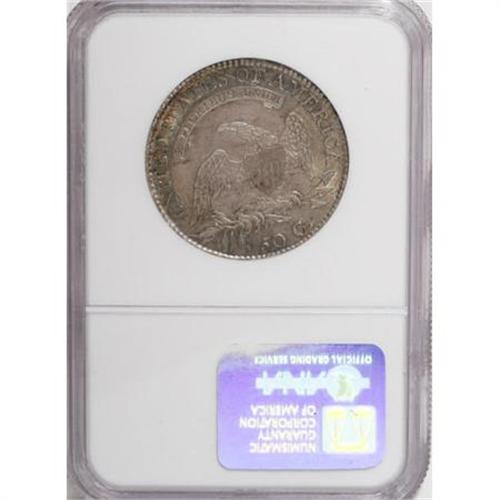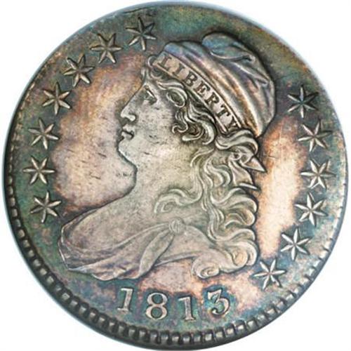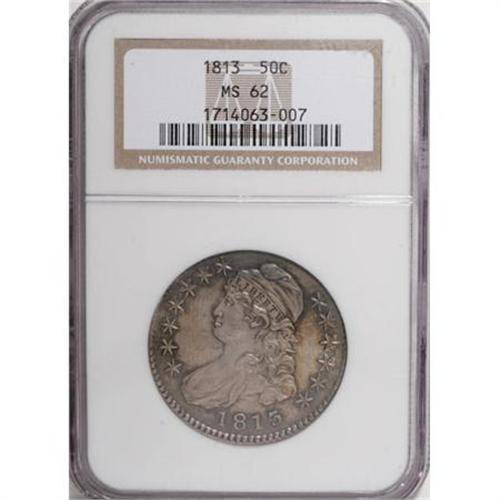 <B>1813 50C MS62 NGC.</B></I> O-107, R.4 for the die state, R.1. for the die marriage. The 10th star is recut on this variety. Sea-green, golden-brown, and dove-gray colors grace this shimmering representative. Boldly die clashed, as made, with a few letters from the reverse motto clearly legible above the date. Well struck and attractive.<BR><BR><B>Coin Engraver:</B> John Reich<BR><BR><b>Shipping:</b> Coins & Currency (<a target="_blank" href="http://www.heritageauctions.com/common/shipping.php">view shipping information</a>)