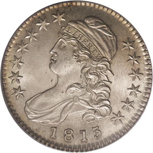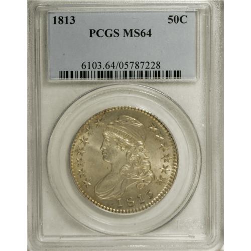 <B>1813 50C MS64 PCGS.</B></I> O-103, R.2. A satiny olive and ivory-gray near-Gem. The fields and devices are splendidly preserved. Sharply struck aside from the upper two left obverse stars, and rarely encountered with such impressive eye appeal. Struck from clashed dies, although not the final die state, which exhibits multiple sets of clash marks. Population: 13 in 64, 2 finer (1/07).<BR><I>From The Rocky Top Collection of Bust Half Dollars.</B></I><BR><BR><b>Shipping:</b> Coins & Currency (<a target="_blank" href="http://www.heritageauctions.com/common/shipping.php">view shipping information</a>)