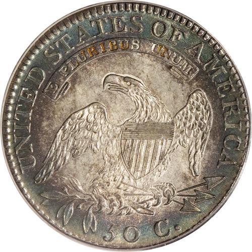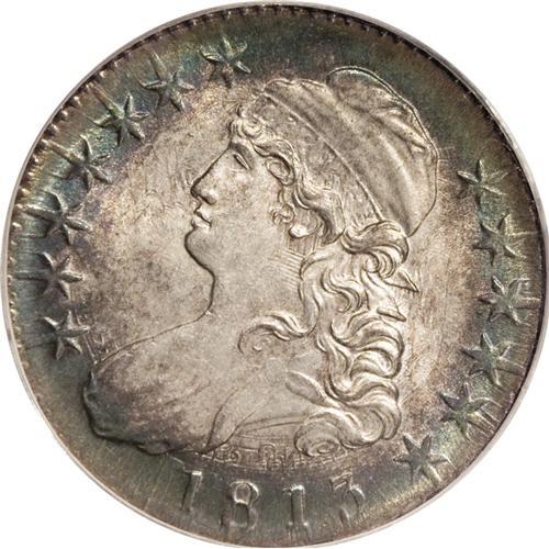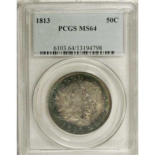 <B>1813 50C MS64 PCGS.</B></I> O-110, R.1. This example has extremely heavy clash marks on the obverse, including almost all of the scroll beneath the bust and also left and right of the hair. The dies clashed at least three times, as certain individual letters can be seen this number of times. A sharply struck example with frosty luster and peripheral sea-green toning.<BR><BR><b>Shipping:</b> Coins & Currency (<a target="_blank" href="http://www.heritageauctions.com/common/shipping.php">view shipping information</a>)