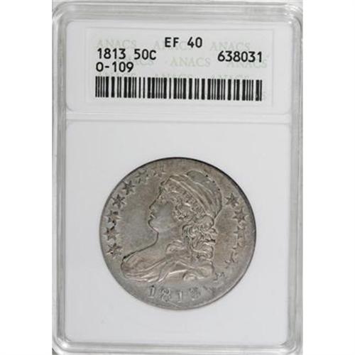 <B>1813 50C XF40 ANACS.</B></I> O-109. NGC Census: (17/327). PCGS Population (20/275). Mintage: 1,241,903. Numismedia Wsl. Price for NGC/PCGS coin in XF40: $200. (#6103)<BR><BR><B>Coin Engraver:</B> John Reich<BR><BR><b>Shipping:</b> Coins & Currency (<a target="_blank" href="http://www.heritageauctions.com/common/shipping.php">view shipping information</a>)