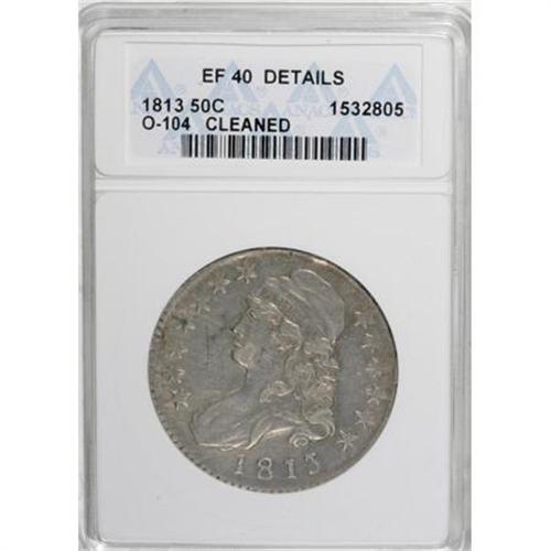 <B>1813 50C --Cleaned--ANACS XF40 Details.</B></I> O-104. NGC Census: (17/328). PCGS Population (20/276). Mintage: 1,241,903. Numismedia Wsl. Price for NGC/PCGS coin in XF40: $200. (#6103)<BR><BR><B>Coin Engraver:</B> John Reich<BR><BR><b>Shipping:</b> Coins & Currency (<a target="_blank" href="http://www.heritageauctions.com/common/shipping.php">view shipping information</a>)