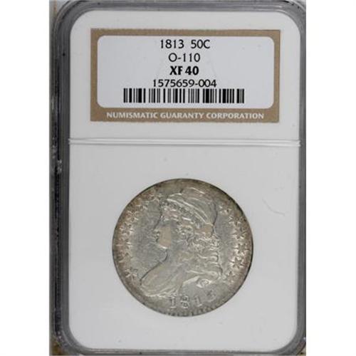<B>1813 50C XF40 NGC.</B></I> O-110. NGC Census: (16/320). PCGS Population (19/265). Mintage: 1,241,903. Numismedia Wsl. Price for NGC/PCGS coin in XF40: $185. (#6103)<BR><BR><B>Coin Engraver:</B> John Reich<BR><BR><b>Shipping:</b> Coins & Currency (<a target="_blank" href="http://www.heritageauctions.com/common/shipping.php">view shipping information</a>)
