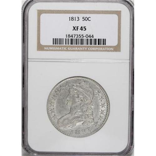 <B>1813 50C XF45 NGC.</B></I> NGC Census: (48/272). PCGS Population (40/226). Mintage: 1,241,903. Numismedia Wsl. Price for NGC/PCGS coin in XF45: $225. (#6103)<BR><BR><B>Coin Engraver:</B> John Reich<BR><BR><b>Shipping:</b> Coins & Currency (<a target="_blank" href="http://www.heritageauctions.com/common/shipping.php">view shipping information</a>)