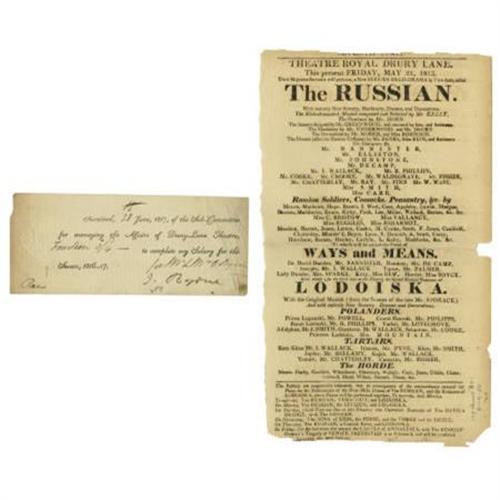 <B>1813 London Theater Broadside</B></I>. One page, single sided, 6.75” x 11.75”, London, May 21, 1813. An advertisement for the 1813 production of <I>The Russian</B></I> at the Theatre Royal Drury Lane, London. The paper has toned, especially at the edges, the edges are chipped and slightly ragged, there is a taped repair at the center fold on the verso, else good condition. Sold with a printed pay voucher, 7” x 3”, with royal tax stamp in blind, dated June 28, 1817, for “<I>Fourteen 3/4</B></I>” to “complete my salary for the Season, 1816-17”, toned at the edges, mounting remnants on the verso, else very good. <I>Ex. Henry E. Luhrs Collection</B></I>.<BR><BR><BR><b>Shipping:</b> Flat Material, Small (<a target="_blank" href="http://www.heritageauctions.com/common/shipping.php">view shipping information</a>)