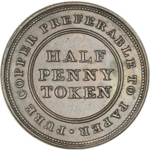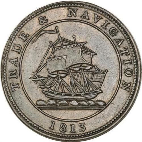 <B>1813 Pure Copper Preferable to Paper Halfpenny Token.</B></I> Breton-965, NS-21A2. Copper, 27 mm. Trade and Navigation token of Nova Scotia. This is a Choice AU token that is far above the typical one found. <BR> <BR><BR><b>Shipping:</b> Coins & Currency (<a target="_blank" href="http://www.heritageauctions.com/common/shipping.php">view shipping information</a>)