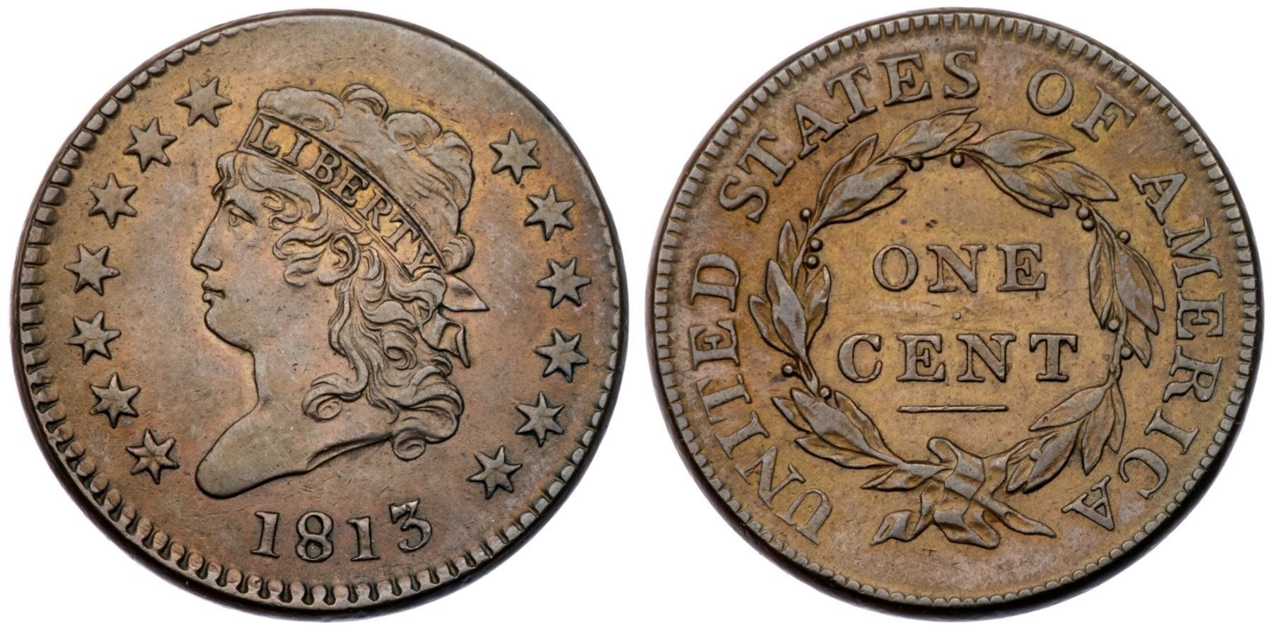 1813 S-292 R2 VF35Slightly sharper with great eye appeal, but there are three very light scratches over CENT. Otherwise this cent is choice with very attractive glossy light chocolate and golden tan toning. MDS, Breen state III, with crisp dentils and faint die clashmarks, strongest at the berry above the N in ONE. Struck with the obverse die slightly misaligned to K-1.Certificate Number: Pedigree: Ex Dean Johnson 6/1979-Fred H. Borcherdt Collection