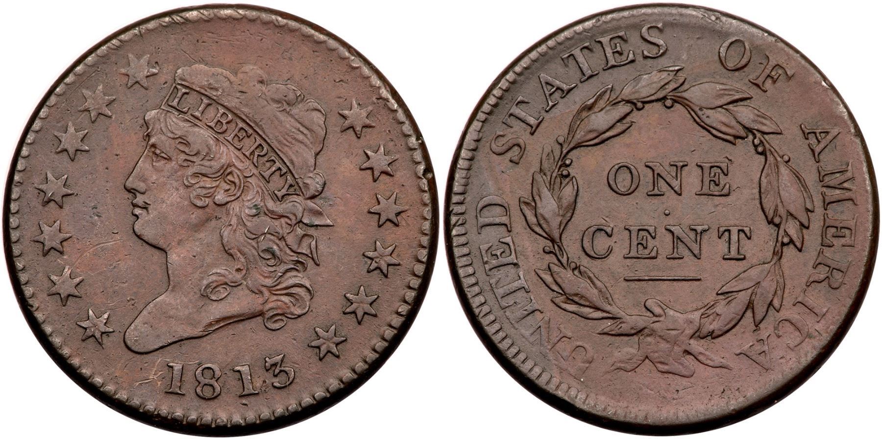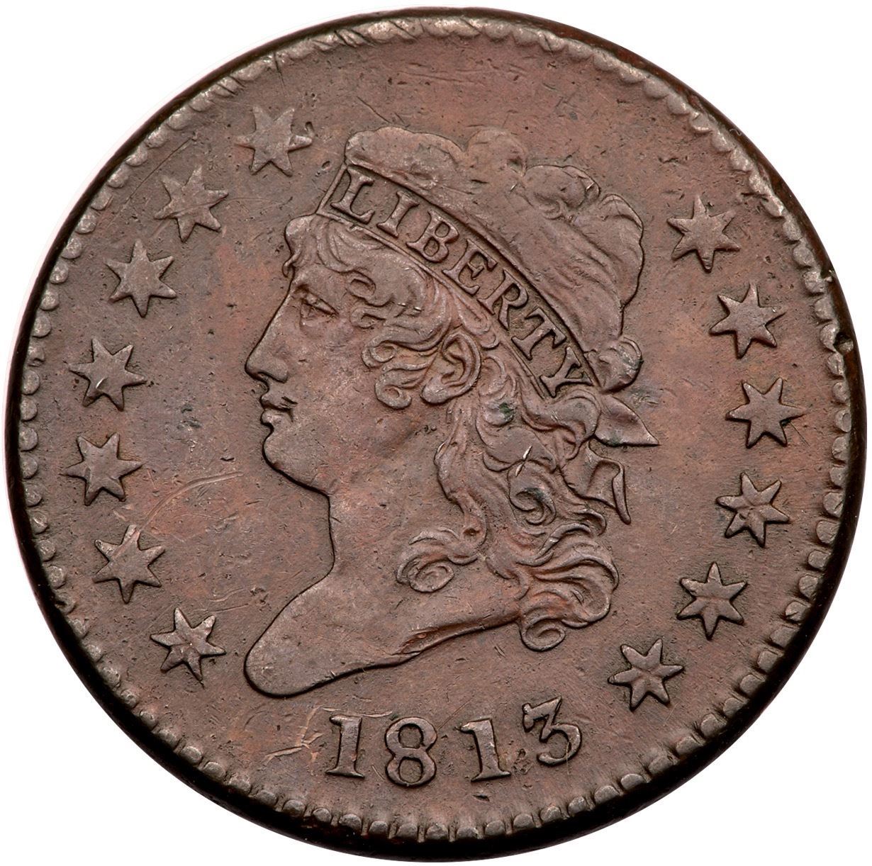 1813 S-293 R-2 VF2010 points sharper but retoned and now a mix of olive, steel brown, and ruddy tan tones. There are also various trivial nicks and a few hairline scratches scattered on the fields and devices, the most notable include one through star 2, a few around 18, and a rim bruise at U in UNITED. Smooth, hard surfaces. LDS, Breen state IV.Certificate Number: Pedigree: Ex; Doug Bird LBCS 2008 - Buck Burgess
