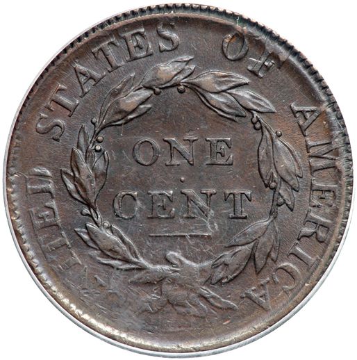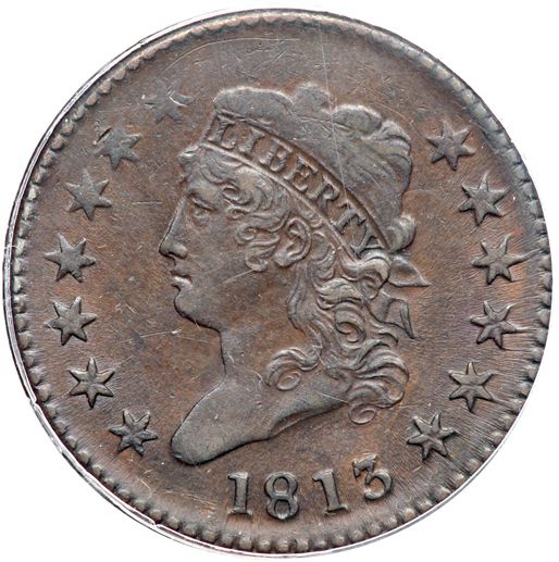 1813 S-293 R2 Turban Head PCGS graded AU50. The so-called 3 over 2 overdate variety. Frosty chocolate and steel. Satiny mint luster shows in some of the protected areas on both sides. No hint of roughness or verdigris. The only marks, and they are not at all significant, are a nick on the outer point of star 6 and a dull scratch down the right side of the D in UNITED. M-LDS, Breen state III. Evidence of the 3 over 2 overdate, which is visible only in the early die state, is gone. The strike is a bit uneven, as usual for the die state, with weakness at stars 6 & 7 and on the opposing UN in UNITED (caused by die faces out of parallel alignment). Our grade is EF40.