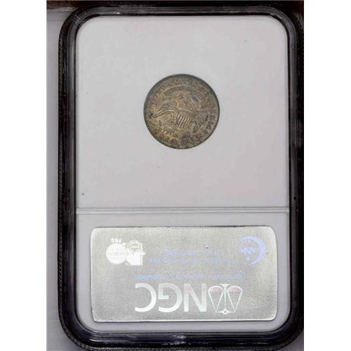 <B>1814<10C> Large Date JR-3, R.2. Reiver state b. AU58 NGC.</B></I> A lovely coin that retains luster in the fields and very attractive gold and blue toning throughout with the desired peripheral flecks of vibrant colors. The surfaces are very clean and show no scratches or nicks worthy of note. This is an early die state where the obverse shows strong clash marks before Liberty's face and lighter in the right obverse field. On the reverse, that die has cracked from the lowest right olive leaf up through the claw, shield to the eagle's beak. A very desirable example of this die pairing.<BR><I>Ex: Penn Jersey (October 1982).</B></I> Envelope Included.