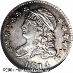 1814 10C Large Date MS64 NGC. JR-2, R-3. Period af <B>1814 10C Large Date MS64 NGC.</B></I> JR-2, R-3. Period after C. Light olive and pearl-gray color enriches this shimmering example, well struck aside from a few right side stars. An early die stage without the bulge that eventually weakens AMERICA. The obverse is splendidly preserved, the reverse has a pair of unimportant short pinscratches but is generally very pleasing. A fortunate specialist will soon treasure this addition to an advanced set of early Capped Bust Dimes. Population: 34 in 64, 17 finer (11/04). <BR><BR><B>Important notice:</B> Heritage usually auctions material at the rate of 200-250 lots per hour. On some occasions eBay Live bid software or the Internet may not be able to keep up with the pace of the auction. We recommend placing a realistic absentee bid now as insurance to avoid disappointment. Occasionally the auctioneer may eliminate or reject an eBay Live bid, and the auctioneer may also reopen a lot after the close of the eBay live bidding (usually because we missed an audience bid), and may reject your bid even if it shows you as the winning bidder. By bidding via eBay Live, you agree that Heritage may award the lot to another bidder at its sole discretion under the circumstances described above or any other reasonable circumstances. Since eBay bids are not shown to us until we open the lot on the floor, we treat those bids just like floor bids. In most cases the floor responds before the eBay bid is presented to us, due to Internet lag time, so for consistency we have made it a policy that floor bids are always considered first over tie eBay live bids. Also please note that all Heritage lots purchased through eBay Live carry a 20% Buyer's Premium. Please make sure you read the Terms and Conditions before you bid. This lot is being auctioned in conjunction with a live floor auction by Heritage Galleries & Auctioneers. All final auction and invoice information will be supplied by Heritage Galleries & Auctioneers, and all other information should be considered preliminary. Lot:5704