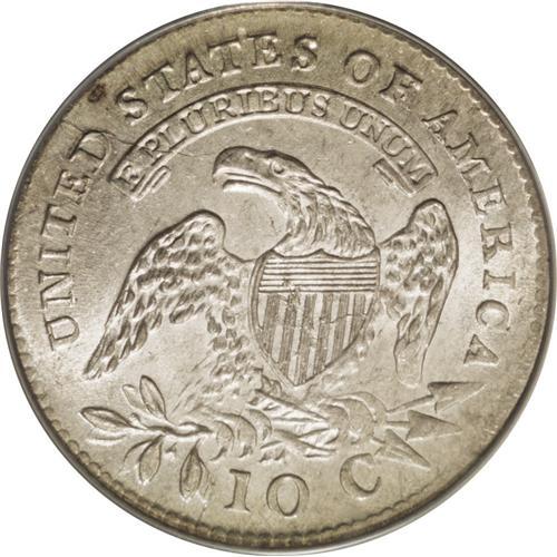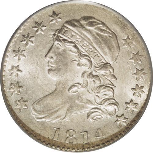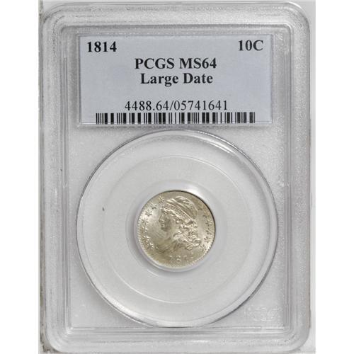 <B>1814<10C> Large Date MS64 PCGS.</B></I> JR-3, R.2. This die variety is distinguishable by the curl extending to the right edge of the second 1 in the date, and the lack of a period after the C of 10 C. Lustrous, silvery surfaces are visited by traces of light tan, and the design elements are well brought up, though some of the star centers are soft. A couple of unobtrusive pinscratches traveling from Liberty's neck to the lower left (facing) obverse field are mentioned for accuracy. The obverse fields display some bold clash marks. Overall, an attractive Capped Bust dime. Population: 20 in 64, 5 finer (7/06).