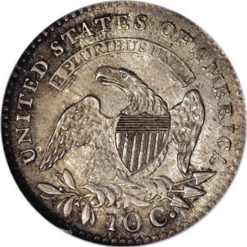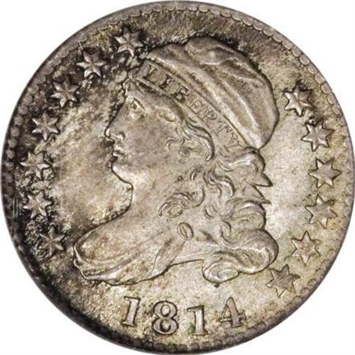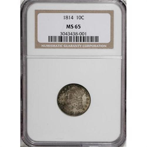 <B>1814 10C Large Date MS65 NGC.</B></I> JR-2, R.3. A deeply toned Gem with intermingled ivory, golden-brown, and steel toning over frosty luster. Although it is considered a slightly scarcer variety, several Mint State examples are known. Alternatively, most of those that do exist in Mint State grades are low on the numerical scale. The obverse die was used for JR-2 in early states, and for JR-3 in later states. No evidence of obverse die bulges are apparent on this example. Two small reverse die bulges can be seen on this piece, and account for its use on this variety and no others. Census: 22 in 65, 13 finer (7/07) for all varieties. This is the only JR-2 dime to be certified MS65 by NGC.<BR><BR><B>Coin Engraver:</B> John Reich<BR><BR><b>Shipping:</b> Coins & Currency (<a target="_blank" href="http://www.heritageauctions.com/common/shipping.php">view shipping information</a>\)