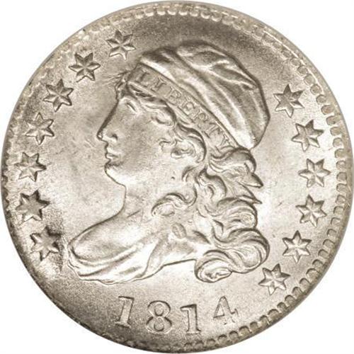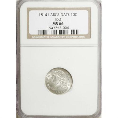 <B>1814 10C Large Date MS66 NGC.</B></I> JR-3, R.2. Liberty's lowest hair curl extends to the right edge of the second 1 in the date, and there is no period after 10 C on this variety. A prominent center dot resides directly below Liberty's earlobe. Intense mint frost illuminates the brilliant, silver-white surfaces, and sharp definition occurs on the design elements, except for softness in some of the star centers. Relatively mild clash marks are noted on the obverse, while more dramatic clash marks, die cracks, and several shallow adjustment marks are exhibited on the reverse. A superior Premium Gem example of this early dime variety. Census: 9 in 66, 2 finer (11/07). <BR><BR><B>Coin Engraver:</B> John Reich<BR><BR><b>Shipping:</b> Coins & Currency (<a target="_blank" href="http://www.heritageauctions.com/common/shipping.php">view shipping information</a>)