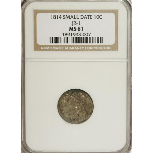 <B>1814 10C Small Date MS61 NGC.</B></I> JR-1, R.3. The sole Small Date die marriage. Pearl-gray and jade-green enrich this shimmering and boldly struck example. The fields are strongly clashed, but consequential contact is absent.<BR><BR><b>Shipping:</b> Coins & Currency (<a target="_blank" href="http://www.heritageauctions.com/common/shipping.php">view shipping information</a>)
