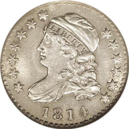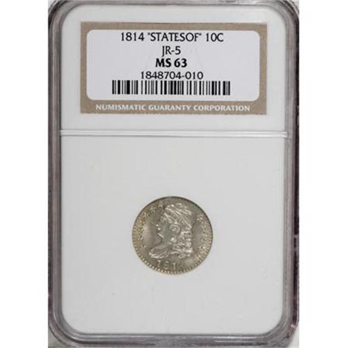 <B>1814 10C STATESOF MS63 NGC.</B></I> JR-5, R.3. The reverse has the distinctive STATESOFAMERICA legend, where the three words are crowded together. This attractive example, largely untoned with a touch of gold over the obverse fields, is well struck overall with softness present at Liberty's upper curls and on the eagle's shield and talons. Strongly lustrous with only light, scattered marks and excellent eye appeal.<BR><BR><B>Coin Engraver:</B> John Reich<BR><BR><b>Shipping:</b> Coins & Currency (<a target="_blank" href="http://www.heritageauctions.com/common/shipping.php">view shipping information</a>\)