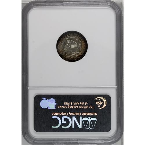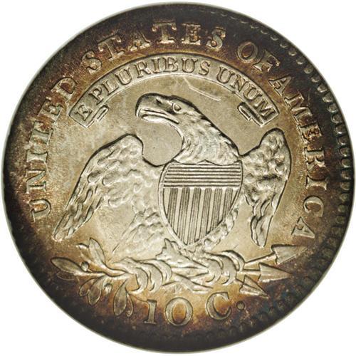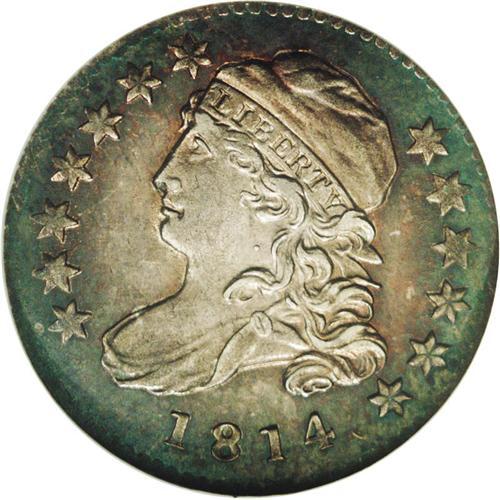 <B>1814<10C> Small Date MS64 NGC.</B></I> JR-1, R.3. This is a scarce variety that is generally offered in grades no finer than VF. Writing in 1984, the John Reich Collectors Society estimated that no more than six Mint State examples of JR-1 are extant. This is a blatantly original near-Gem with rich, charcoal-copper toning and blue-green highlights that deepen at the borders. Well centered, the strike is also sufficiently bold over the central devices. The surfaces are moderately bright beneath the toning with no singularly mentionable abrasions. Minor die clashing is reported mostly in the reverse field. Census: 9 in 64, 6 finer (2/06).