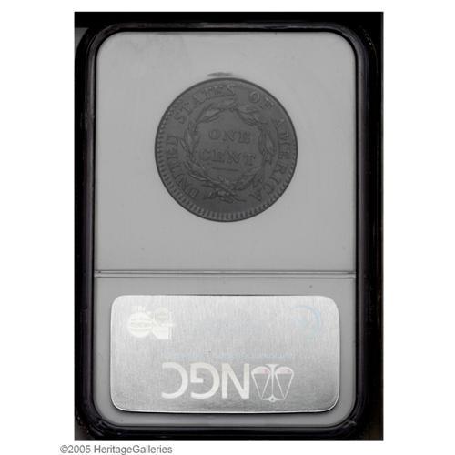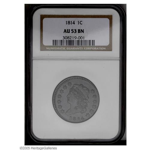 <B>1814<1C> Crosslet 4 AU53 NGC.</B></I> S-294, R.1. This sharp ebony-brown final year Classic Cent displays only slight highpoint wear, and none of the minor marks singularly distract. Struck a few degrees off center toward 4:30, affecting some dentils but no other design elements.