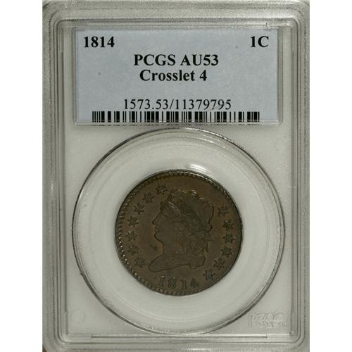 <B>1814 1C Crosslet 4 AU53 PCGS.</B></I> S-294, B-1, R.1. This typically struck chocolate-brown example displays modest wear for the grade and subtle remnants of satin luster. The fields display few marks overall. EAC 35.<BR><BR><b>Shipping:</b> Coins & Currency (<a target="_blank" href="http://www.heritageauctions.com/common/shipping.php">view shipping information</a>)