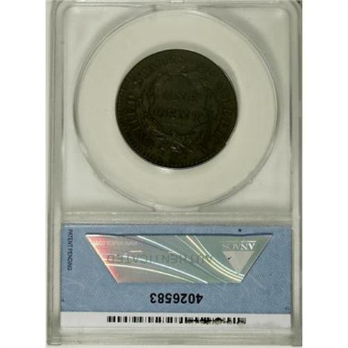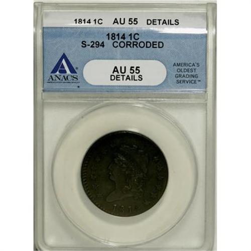 <B>1814 1C Crosslet 4--Corroded--ANACS. AU55 Details. </B></I> S-294, B-1, R.1. The Crosslet 4 in the date identifies this variety. This is a charcoal-brown example with excellent details and moderate corrosion across both sides. Well struck and well centered on the planchet, with few marks except for the occasional small planchet flaw. EAC 20.<BR><BR><B>Coin Engraver:</B> John Reich<BR><BR><b>Shipping:</b> Coins & Currency (<a target="_blank" href="http://www.heritageauctions.com/common/shipping.php">view shipping information</a>)