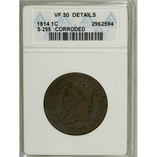 <B>1814 1C Crosslet 4--Corroded--ANACS. VF30 Details.</B></I> S-295. NGC Census: (22/164). PCGS Population (12/143). Mintage: 357,830. Numismedia Wsl. Price: $549. (#1573)<BR><BR><b>Shipping:</b> Coins & Currency (<a target="_blank" href="http://www.heritageauctions.com/common/shipping.php">view shipping information</a>)