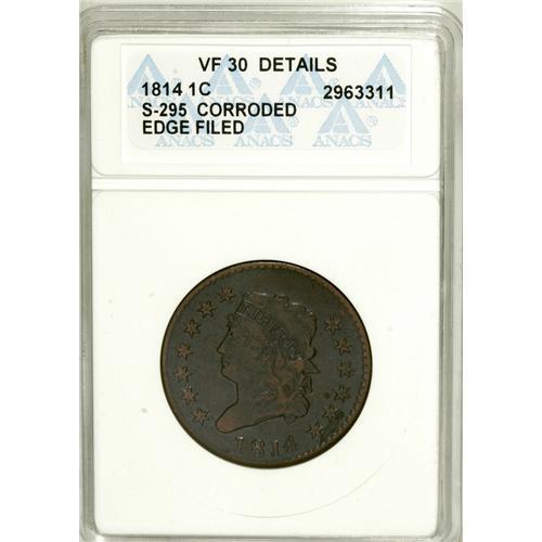 <B>1814 1C Crosslet 4--Corroded, Edge Filed--ANACS. VF30 Details.</B></I> S-295. NGC Census: (22/164). PCGS Population (12/143). Mintage: 357,830. Numismedia Wsl. Price for NGC/PCGS coin in VF30: $549. (#1573)<BR><BR><b>Shipping:</b> Coins & Currency (<a target="_blank" href="http://www.heritageauctions.com/common/shipping.php">view shipping information</a>)