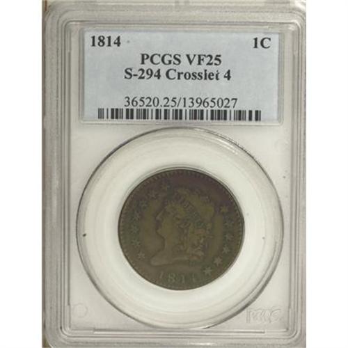 <B>1814 1C Crosslet 4 VF25 PCGS.</B></I> S-294, B-1, R.1, the sole Crosslet 4 variety. An evenly and moderately circulated medium brown representative. A strong loupe reveals a few wispy obverse marks, mostly on the lower left field. EAC 20.<BR><I>Ex: River Hollow, BRNA Show, 8/96.</B></I><BR><BR><b>Shipping:</b> Coins & Currency (<a target="_blank" href="http://www.heritageauctions.com/common/shipping.php">view shipping information</a>)