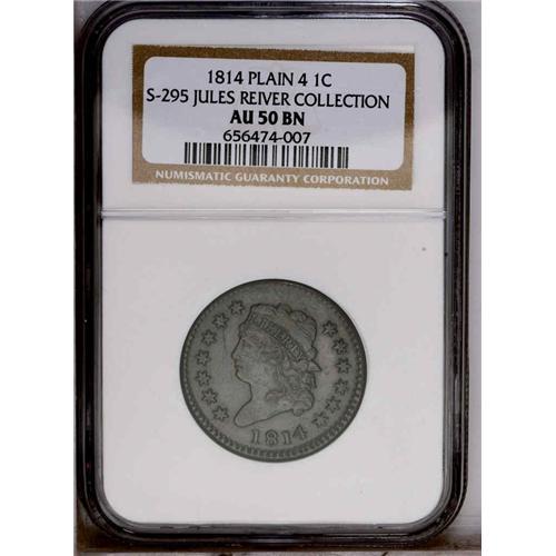 1814 1C Plain 4 AU50 NGC. S-295, R.1. Die State II. Pr 1814[1C] Plain 4. S-295, B-2, R.1. AU50 NGC.