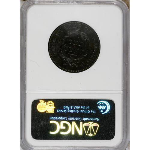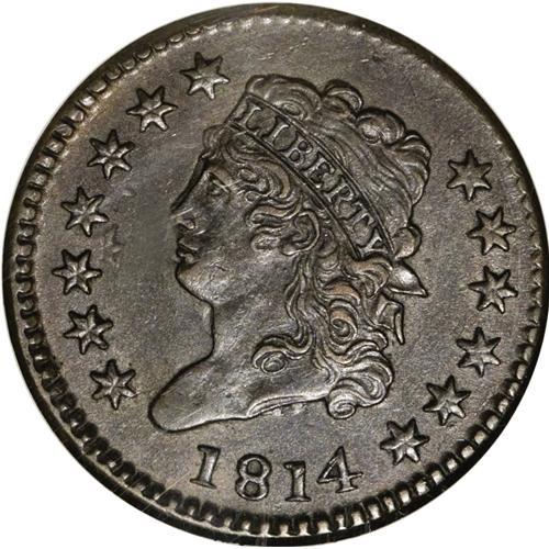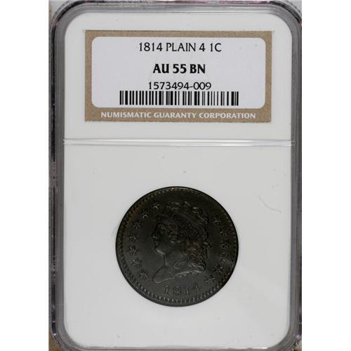 <B>1814 1C Plain 4 AU55 NGC.</B></I> S-295, B-2, R.1. This darkly toned piece has noticeable luster on both sides. Traces of lighter orange color are evident on both sides. Traces of wear are evident as lighter tan color on the high points of the design. The dies were slightly misaligned when this early die state piece was struck. EAC 40.<BR><BR><b>Shipping:</b> Coins & Currency (<a target="_blank" href="http://www.heritageauctions.com/common/shipping.php">view shipping information</a>)