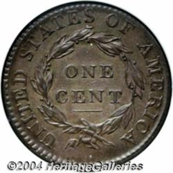 <table><tr><td><table><tr><td>1814 1C Plain 4 MS64 Brown NGC. S-295, R.1. A crisply struck mauve-brown near-Gem that has refreshingly unmarked surfaces. Traces of olive patina outline the legends and devices. The sole Plain 4 variety, and the final Sheldon marriage. No Cents are dated 1815, since the War of 1812 interrupted the supply of planchets from Boulton's mint in England. Population: 2 in 64 Brown, none finer (3/04). <BR><BR><B>Important notice:</B> Heritage usually auctions material at the rate of 200-250 lots per hour. On some occasions eBay Live bid software or the Internet may not be able to keep up with the pace of the auction. We recommend placing a realistic absentee bid now as insurance to avoid disappointment. Occasionally the auctioneer may eliminate or reject an eBay Live bid, and the auctioneer may also reopen a lot after the close of the eBay live bidding (usually because we missed an audience bid), and may reject your bid even if it shows you as the winning bidder. By bidding via eBay Live, you agree that Heritage may award the lot to another bidder at its sole discretion under the circumstances described above or any other reasonable circumstances. Since eBay bids are not shown to us until we open the lot on the floor, we treat those bids just like floor bids. In most cases the floor responds before the eBay bid is presented to us, due to Internet lag time, so for consistency we have made it a policy that floor bids are always considered first over tie eBay live bids. Also please note that all Heritage lots purchased through eBay Live carry a 20% Buyer's Premium. Please make sure you read the Terms and Conditions before you bid. <BR><BR><B>IMPORTANT ANNOUNCEMENT ABOUT RESERVES:</B> Heritage now divulges all reserves on its web site 7 days before every auction. If you want to know whether the reserve on this lot has been met, and if not, what the reserve amount is, please visit this lot page on the HeritageCoin.com web site, or email: bid@HeritageGalleries.com </span></font></td></tr></table></td></tr></table>