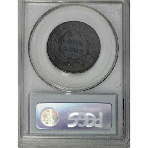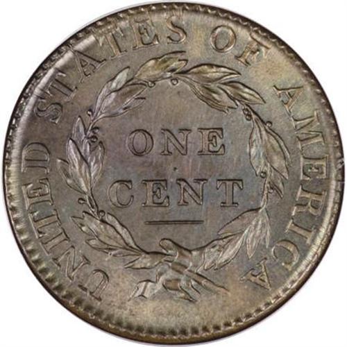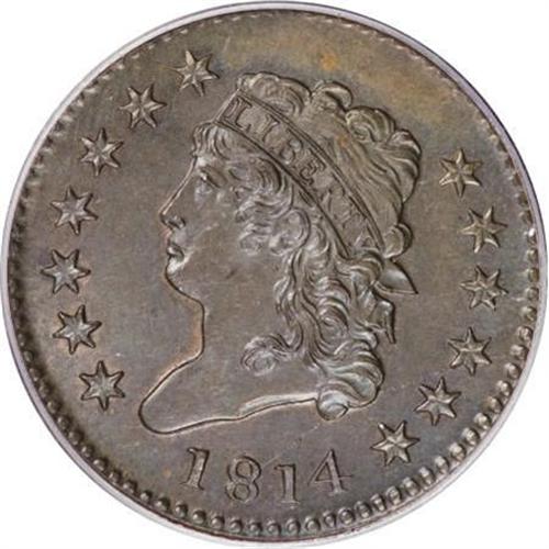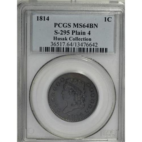 <B>1814 1C Plain 4. MS64 Brown PCGS. S-295, B-2, R.1. </B></I> <B>Noyes AU55; tied for CC-10. Photo #34021. Our EAC Grade AU50.<BR><BR>Equivalents. </B></I>Proskey 2; Doughty 225; McGirk 2A; Clapp 2; EAC 2; <I>Encyclopedia </B></I>1789; PCGS #1576.<BR><B><BR>Variety. </B></I>Plain 4. Leaf point at center of D. The obverse appears on S-295. The reverse appears on S-295.<BR><B><BR>Surfaces. </B></I>Impressive, virtually flawless olive and gold surfaces retain traces of faded mint red on each side. A single mark below Liberty's chin and a few other microscopic blemishes are visible on the obverse. A bold strike; the narrow borders are complete on both sides, although the impression is imperfectly centered.<BR><BR><B>Die State VI. </B></I>An intermediate state. The die crack from star 11 to the lowest curl and the digit 8 is complete, but neither die shows any trace of clash marks or crumbling seen in later states.<BR><BR><B>Census. </B></I>Bland recorded a few selected Mint State examples of this variety in place of a comprehensive Census record.<BR><BR><B>Historical Note</B></I>. Montroville W. Dickeson comments about the 1814 cents: "Additional value has been attached to the issues of that year, in consequence of a rumor that it contained gold lost at the Mint at that time. Many cling to them with much tenacity on that account - the slightest basis for credulity being ardently responded to."<BR><BR><B>Provenance. </B></I><I>Gene Reale (Sotheby's, 1/1998), lot 54, $8,250.</B></I><BR><BR><B>Personality. Gene Reale</B></I> assembled a remarkable collection of large cents, and produced a full-color photographic record book that was published circa 1995 in an extremely limited edition. Cents from his collection are recorded in auction catalogs produced by Bowers and Merena in 1995 and Sotheby's in 1998.<BR><BR><b>Shipping:</b> Coins & Currency (<a target="_blank" href="http://www.heritageauctions.com/common/shipping.php">view shipping information</a>)