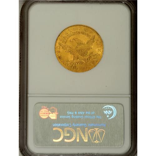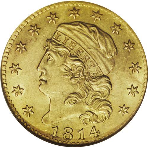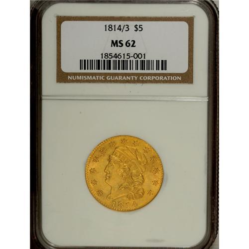 <B>1814/3 $5 MS62 PCGS.</B></I> B. 1-A, Miller-121, R.4. While not one of the elite rarities in the ultra-challenging Capped Head Left series of half eagles, this issue of just 15,454 pieces is nevertheless a very difficult coin in Uncirculated grades and enjoys popularity as the most obtainable of four overdates (one a great rarity) within the brief series. This satiny greenish-gold representative is well defined save for a few of Liberty's highest curls and the eagle's claws. Die clashing, a hallmark of the issue, is visible on both sides. Census: 12 in 62, 14 finer (11/06).<BR><BR><b>Shipping:</b> Coin/Currency (<a target="_blank" href="http://www.heritageauctions.com/common/shipping.php">view shipping information</a>)