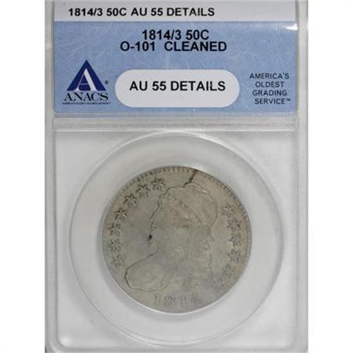 <B>1814/3 50C --Cleaned--ANACS. AU55 Details.</B></I> O-101. NGC Census: (8/25). PCGS Population (17/13). Numismedia Wsl. Price for NGC/PCGS coin in AU55: $1,600. (#6106)<BR><BR><B>Coin Engraver:</B> John Reich<BR><BR><b>Shipping:</b> Coins & Currency (<a target="_blank" href="http://www.heritageauctions.com/common/shipping.php">view shipping information</a>)