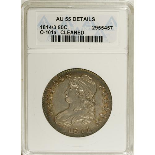 <B>1814/3 50C --Cleaned--ANACS. AU55 Details.</B></I> O-101a, R.2. Ice-blue and walnut-tan peripheries cede to pearl-gray centers. Although light hairlines are present, this is an evenly struck and attractive piece with only minor highpoint wear. Struck from multiply clashed, cracked, and widely rotated dies.<BR><I>From The Hoosier Discovery Collection.</B></I><BR><BR><b>Shipping:</b> Coins & Currency (<a target="_blank" href="http://www.heritageauctions.com/common/shipping.php">view shipping information</a>)