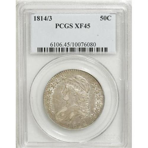 <B>1814/3 50C XF45 PCGS.</B></I> O-101a, R.2. Bright luster illuminates selected areas of this dove-gray overdate half. A very late die state with heavy cracks, blurry clash marks, and fading peripheral details. About half of the dentils are no longer present, as made. Population: 11 in 45, 49 finer (11/07).<BR><BR><B>Coin Engraver:</B> John Reich<BR><BR><b>Shipping:</b> Coins & Currency (<a target="_blank" href="http://www.heritageauctions.com/common/shipping.php">view shipping information</a>)