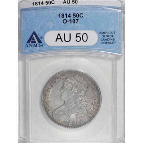 <B>1814 50C AU50 ANACS.</B></I> O-107. NGC Census: (26/34671). PCGS Population (29/211). Mintage: 1,039,075. Numismedia Wsl. Price for NGC/PCGS coin in AU50: $400. (#6105)<BR><BR><B>Coin Engraver:</B> John Reich<BR><BR><b>Shipping:</b> Coins & Currency (<a target="_blank" href="http://www.heritageauctions.com/common/shipping.php">view shipping information</a>)