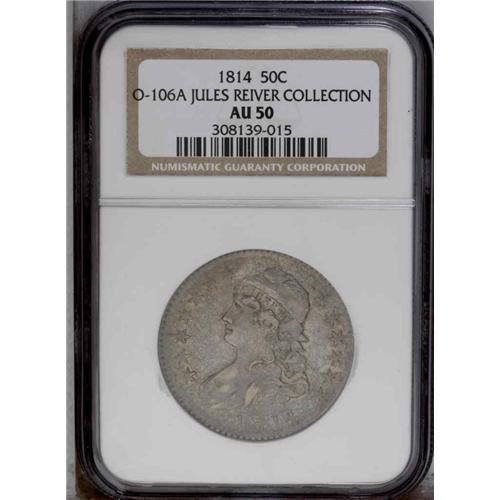 <B>1814<50C> AU50 NGC.</B></I> O-106a, High R.4. A high grade example of this scarce variety, with just three pieces currently known in the NGC Census data, and this coin is highest graded of those three. This piece is smooth and evenly toned over both sides, in light pinkish-gray color, with mint-green and golden highlights near the peripheries. Heavily die cracked on each side. Weakly impressed, this is apparently common for the variety, as the coin pictured in the latest edition of Overton is equally soft on the highpoints. An important coin for the Bust Half specialist.<BR><I>Ex: Don Frederick (1/30/1980).</B></I> Envelope Included.