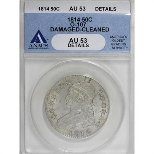 <B>1814 50C --Cleaned, Damaged--ANACS. AU53 Details.</B></I> O-107. NGC Census: (16/31265). PCGS Population (18/193). Mintage: 1,039,075. Numismedia Wsl. Price for NGC/PCGS coin in AU53: $450. (#6105)<BR><BR><B>Coin Engraver:</B> John Reich<BR><BR><b>Shipping:</b> Coins & Currency (<a target="_blank" href="http://www.heritageauctions.com/common/shipping.php">view shipping information</a>)