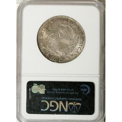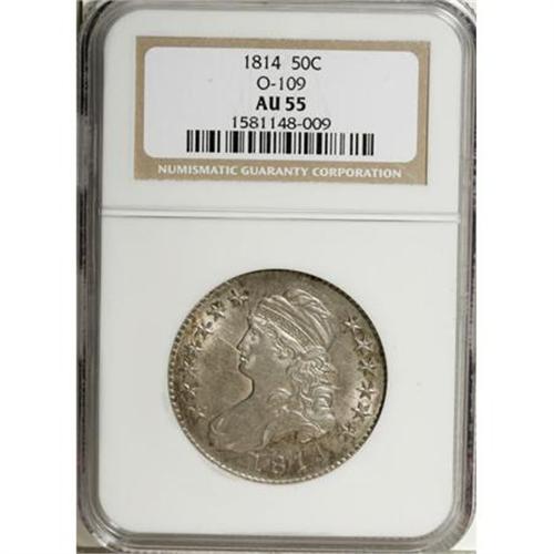 <B>1814 50C AU55 NGC.</B></I> O-109, R.2. This variety features the widest date from 1814 (10.25 mm). There are a pair of center dots on the reverse; one between horizontal stripes 4 and 5, the other between stripes 5 and 6. Both sides show heavy clash marks. The design elements are well struck and the surfaces show minimal disturbances. A mixture of pleasing golden-brown and rose toning adorns both sides. <BR><BR><B>Coin Engraver:</B> John Reich<BR><BR><b>Shipping:</b> Coins & Currency (<a target="_blank" href="http://www.heritageauctions.com/common/shipping.php">view shipping information</a>)