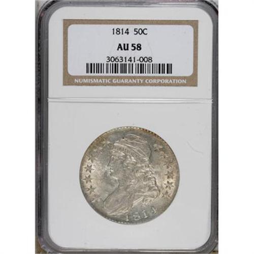 <B>1814 50C AU58 NGC.</B></I> O-107, R.2. Multiple layers of clash marks provide for ready attribution. This lustrous Bust half has light to medium tan patina. An absence of identifying marks ensures the eye appeal.<BR><BR><b>Shipping:</b> Coins & Currency (<a target="_blank" href="http://www.heritageauctions.com/common/shipping.php">view shipping information</a>)