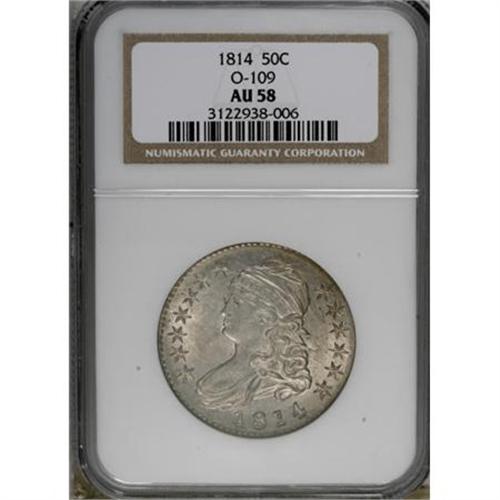 <B>1814 50C AU58 NGC.</B></I> O-109, R.2. A distinctive curl beneath the L of LIBERTY is diagnostic for this die pair. This near-Mint example retains strong luster despite a hint of highpoint friction. Well struck from heavily clashed dies with elements of orange toning at the right obverse.<BR><BR><B>Coin Engraver:</B> John Reich<BR><BR><b>Shipping:</b> Coins & Currency (<a target="_blank" href="http://www.heritageauctions.com/common/shipping.php">view shipping information</a>)